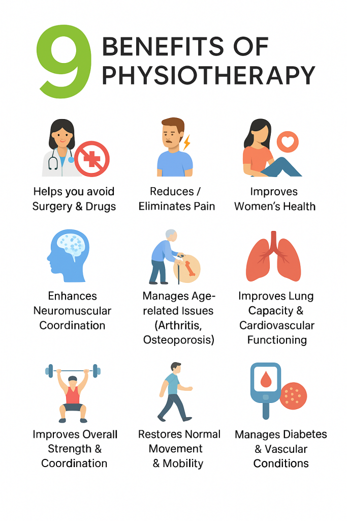 Physiotherapy is a holistic health treatment that heals the body naturally and is not limited to just exercises. It is a great help in the recovery process of the patient as it stops the dependency on medicines and surgeries effectively. Some of the primary benefits of physiotherapy can be summarized as follows: